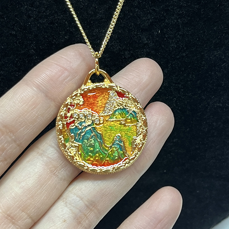 Αυτό σοδειά-στυλ cloisonné σμάλτο κρεμαστό κολιέ είναι ένα αριστούργημα της παραδοσιακής χειροτεχνίας, συνδυάζοντας την πολιτιστική τέχνη με τη σύγχρονη κομψότητα. Το κρεμαστό είναι κατασκευασμένο από ψηλά-ποιότητας ορείχαλκο ή χαλκός, επιμεταλλωμένο με Χρυσός 18.000 για να ενισχύσει τη λάμψη, την ανθεκτικότητα και την αντίσταση στην αμαρτία. Η μπροστινή πλευρά του κρεμαστού προβάλλει α. Λεπτομερής ζωγραφική σμάλτου, με ζωντανό τοπίο σκηνή, ενδεχομένως εμπνευσμένο από Παραδοσιακοί κινεζικοί πίνακες, προσθέτοντας μια αίσθηση ιστορικής γοητείας. Η αντίστροφη πλευρά είναι χαραγμένη με περίπλοκα χρυσά σχέδια, κάνοντας το κολιέ α διπλός-ομώνης Δήλωση.