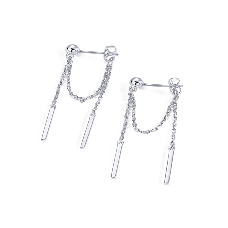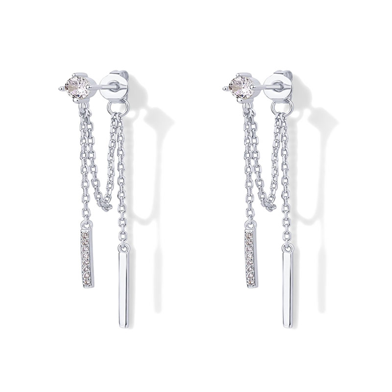 πολυτελές οπτικό αποτέλεσμα. Δύο λεπτές ασημένιες αλυσίδες κρέμονται από τα σκουλαρίκια, η καθεμία στολισμένη