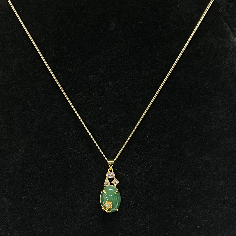 Αυτό το εξαιρετικό κολιέ διαθέτει ένα λεπτό σχέδιο, παρουσιάζοντας ένα εκπληκτικό πράσινο μενταγιόν Jade, το οποίο βρίσκεται σε χρυσό-επιμεταλλωμένο μέταλλο και διακοσμημένο με αφρώδες λευκές πέτρες ζιρκονίου. Το κρεμαστό'Η βάση S είναι κατασκευασμένη από Premium Green Jade, γνωστή για την πλούσια ιστορία και την πολιτιστική του σημασία. Το Green Jade αποτιμάται για τις θεραπευτικές του ιδιότητες και το βαθύ, πολυτελές χρώμα του. Το μενταγιόν διαμορφώνεται σε ένα κομψό ωοειδές, προσφέροντας μια ομαλή επιφάνεια που τονίζει τον πλούτο του νεφρίτη, ενώ ο καλός χρυσός-Το επιμεταλλωμένο μεταλλικό έργο προσθέτει ένα πλούσιο φινίρισμα.